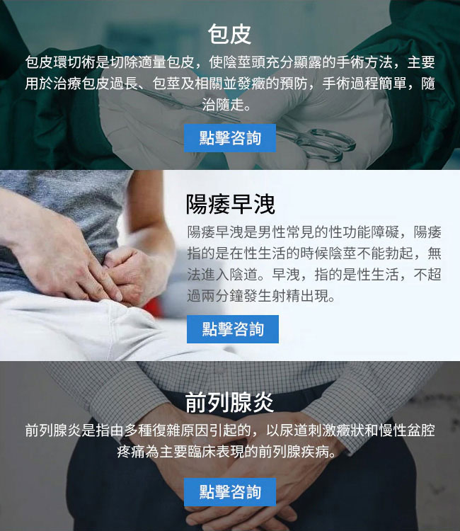 阳痿、早泄、射精障碍射精延迟、性欲减退、包皮过长、包茎、包皮龟头炎、前列腺疾病、慢性前列腺炎、细菌性前列腺炎、尿路感染、尿道炎、滴虫性尿道炎、滴虫性龟头炎、尿失禁